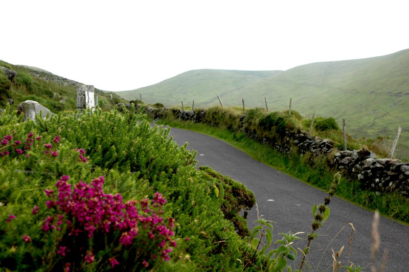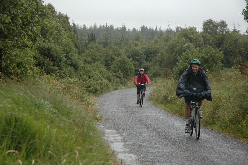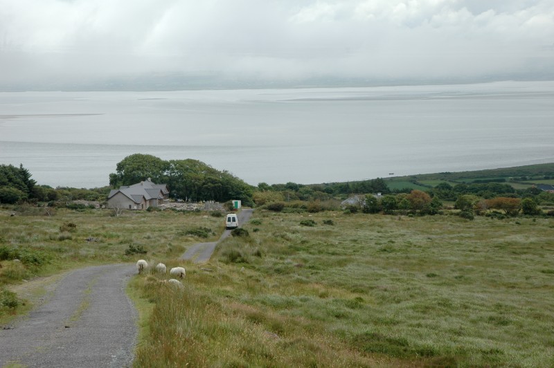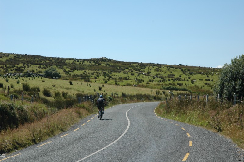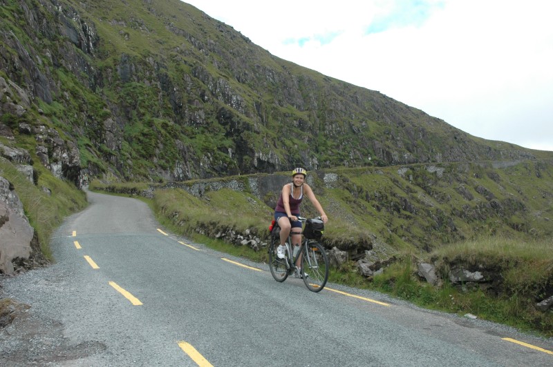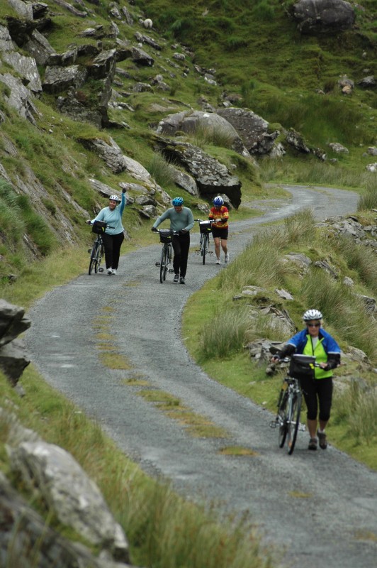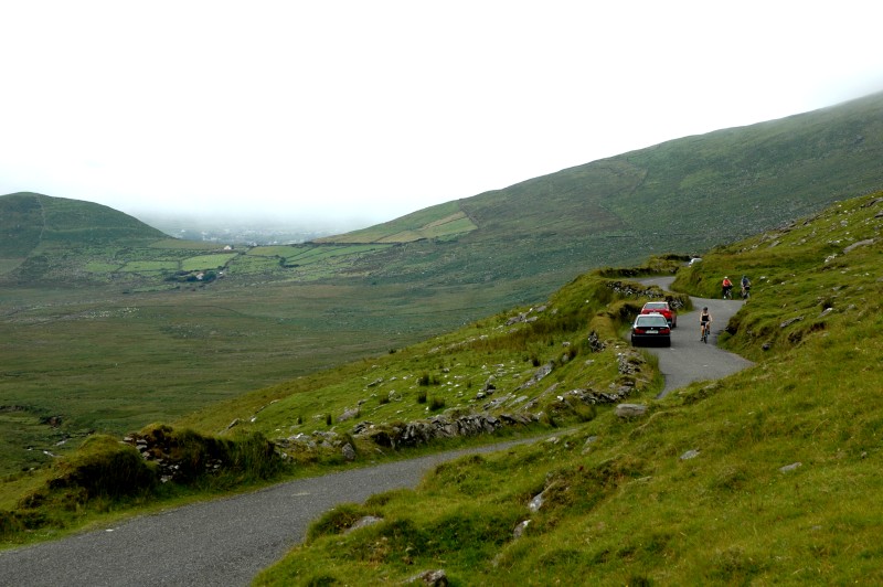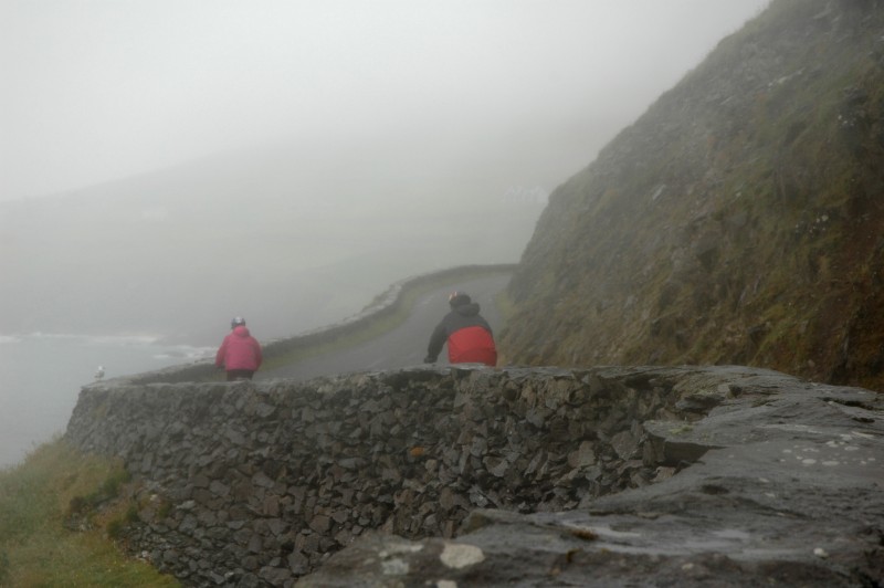 With some bruised bottoms and sore legs in the morning, we had a gentle hill out of town. After backtracking for 6km, we turned on to a narrow backroad that climbed gently, steeply and finally very steeply to the Gap of Ballagheama. For much of this ride, it was raining – our first wet weather.