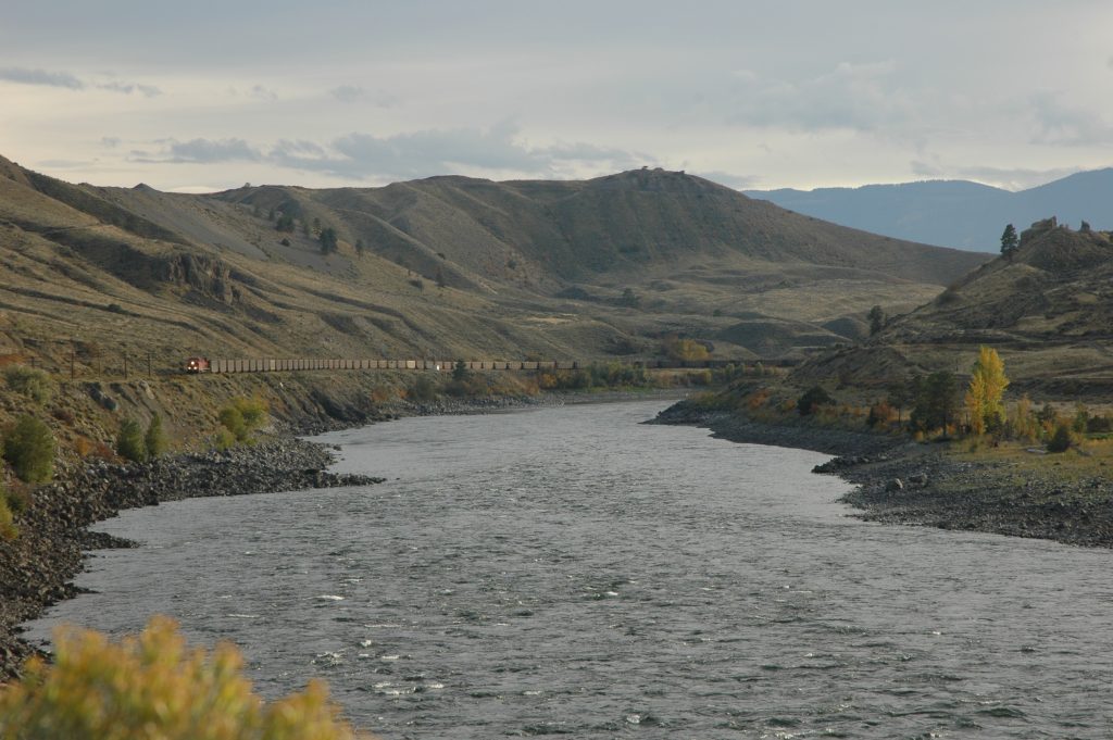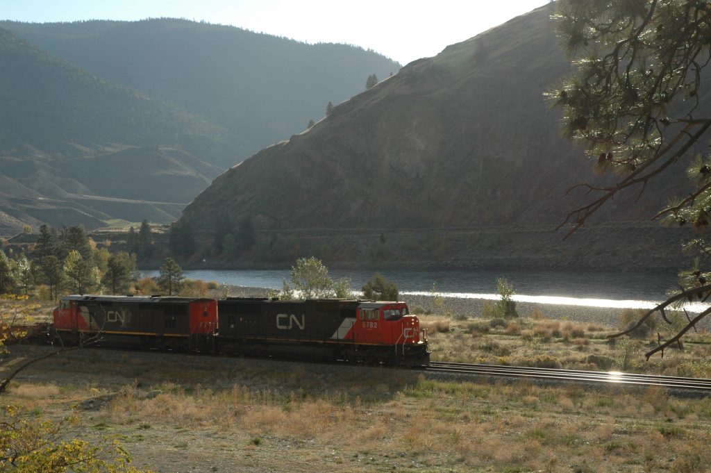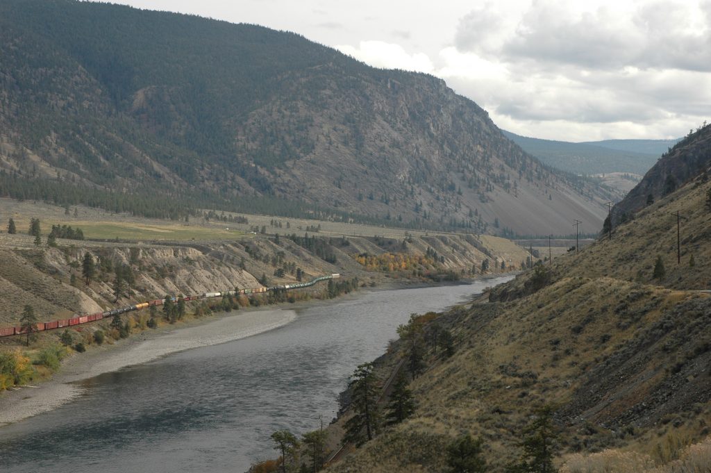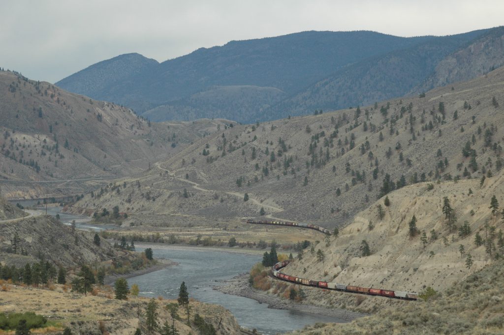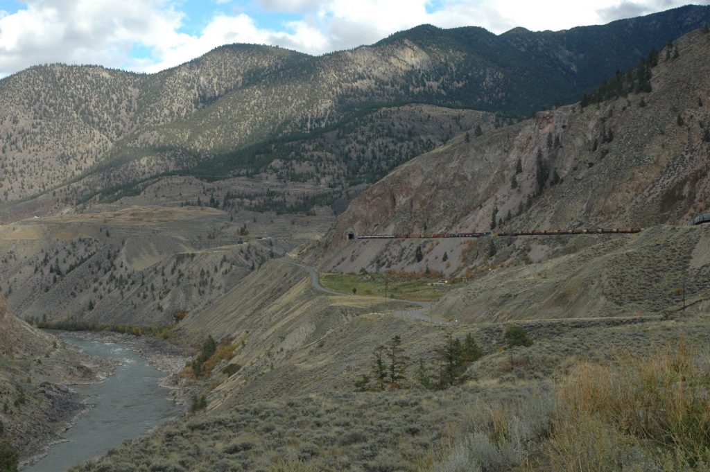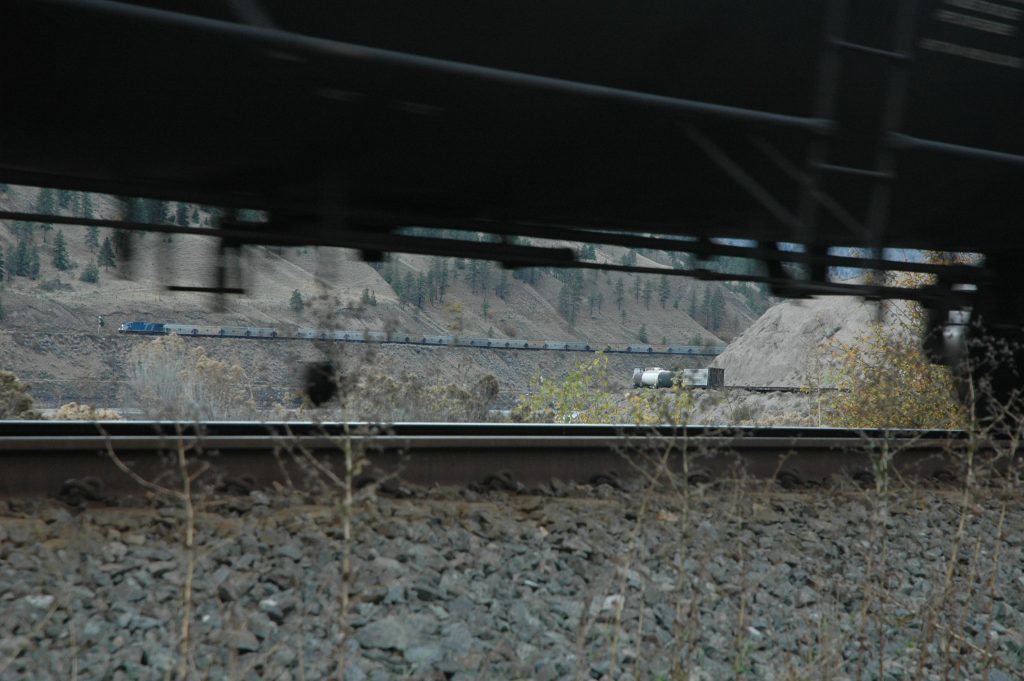 Sunday morning, I went for a bike ride around Spences Bridge (and saw some trains). Late morning, most of the group drove the bikes up the Nicola Valley about 25km. We then bicycled along the abandoned railway grade (part of CPR’s Princeton Subdivision) back to the Thompson River. Some of us did an additional bike ride north along the Thompson River for several kilometres (and saw some trains).