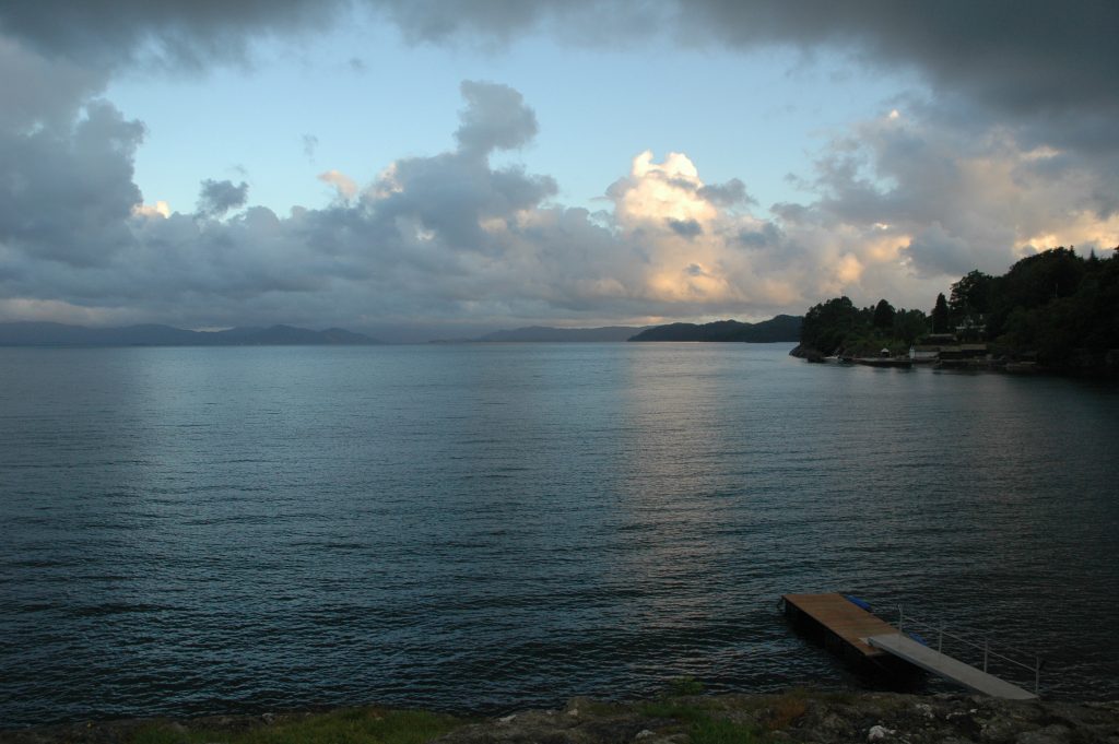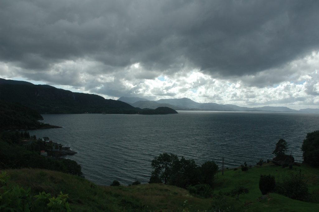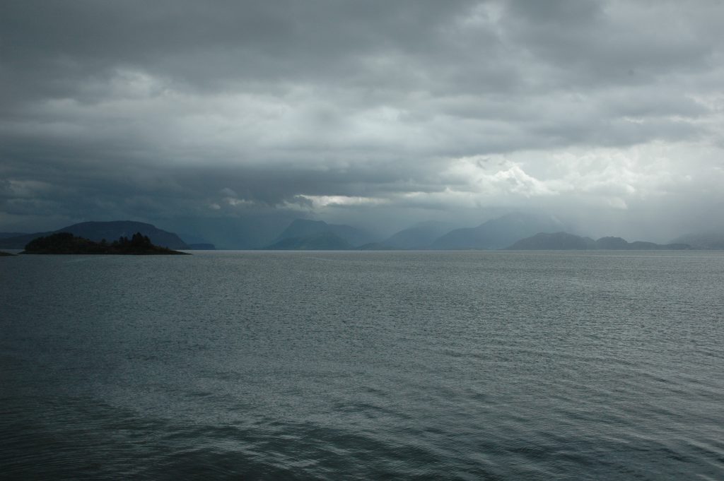 We began with a short ride in light rain to a ferry which took us to another island. We cycled along the Hardangerfjord before cutting overland into sunshine and Bjørnafjord. We crossed over another sea bridge to the mainland and stopped for lunch. After lunch, the route was through a series of passes then along another fjord to a short ferry ride into Os. Fortunately, this ferry was frequent so there was less pressure to cycle quickly.