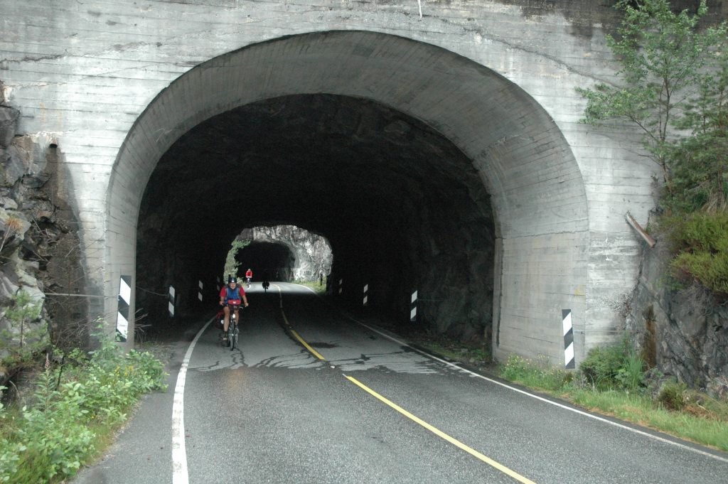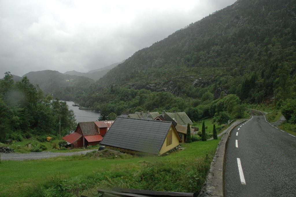 From our hotel near Os, we headed off up a quiet backroad along Samnangerfjord. After about 20km, the road climbed up away from the fjord and joined a more major highway for the climb over a pass and several tunnels. Unfortunately, it started to rain which made for a wet, discouraging ride alongside the trucks over the pass and into Trengereid, our lunch stop.