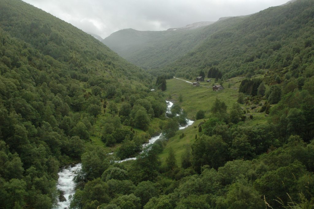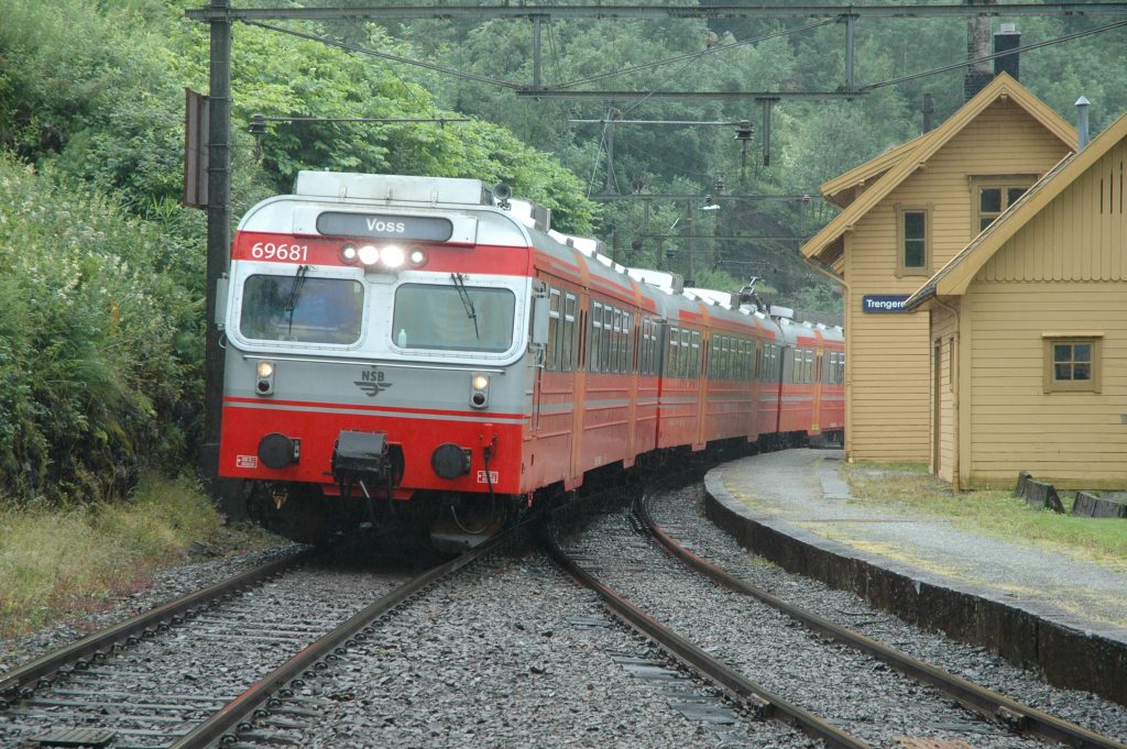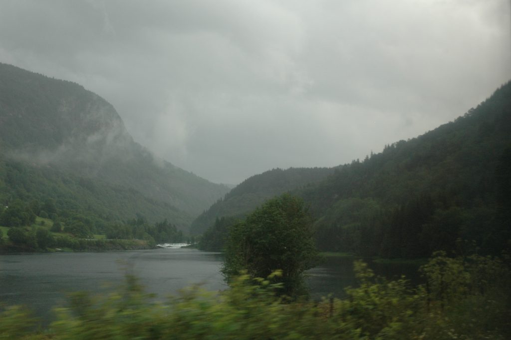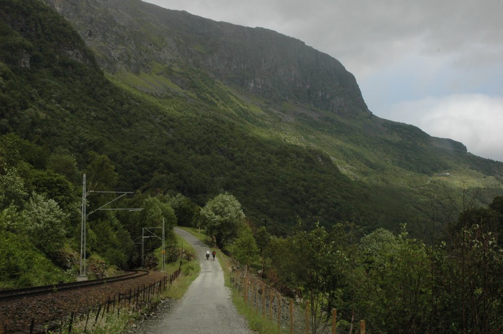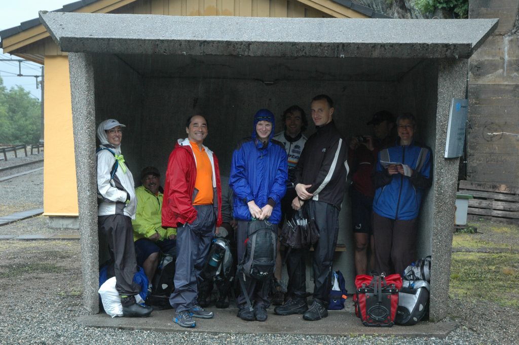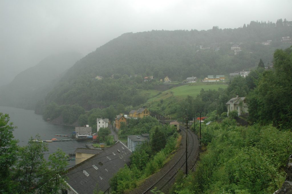 The plan for after lunch was a short train ride to Dale, to bypass some long tunnels, then cycle to Voss. Because we were wet, cold and it continued to rain, we decided to go all the way to Voss by train. We left the bicycles with Marcel at the lunch stop, then walked down to the train ‘station’, which turned out to be just a bus shelter. After the train ride, we warmed up and relaxed for the afternoon in Voss.
