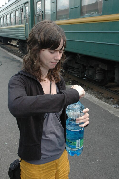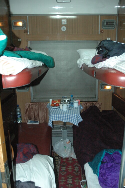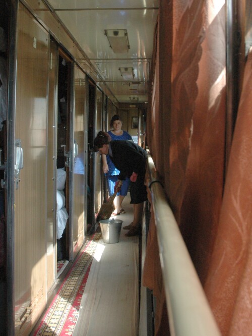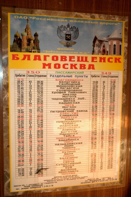 The attendants in our car guarded the steps at stops, cleaned the car and toilets and rarely smiled. Our lives were governed by the schedule posted in the corridor which set out the scheduled arrival and durations of all the stops. The toilets were locked 20 minutes before and after stations. The entire train and all the stations ran on Moscow time – even when local time was 5 hours ahead.
