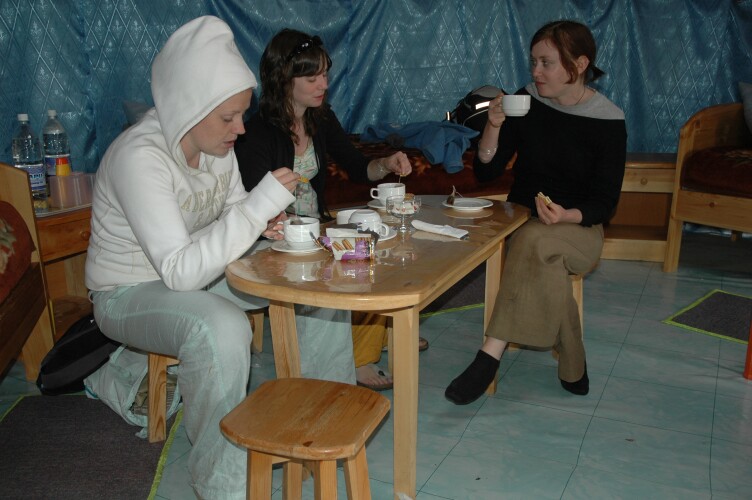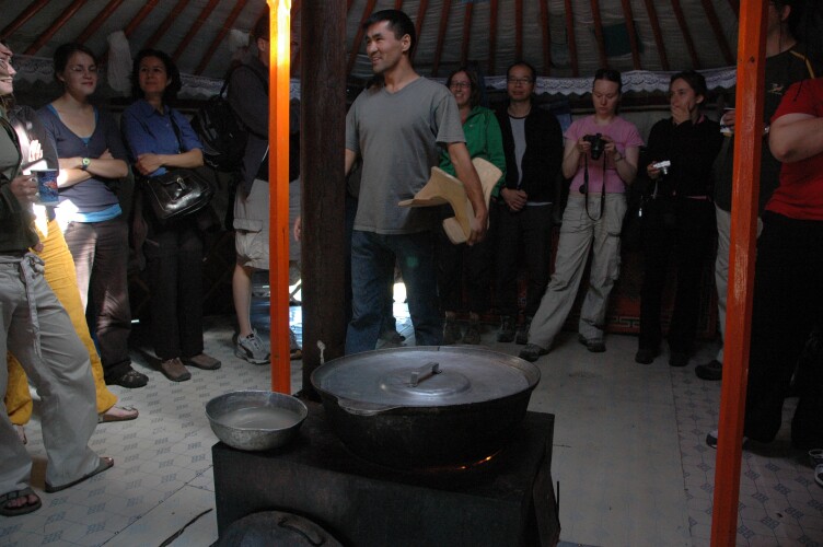 After exchanging our US Dollars for Mongolian Tugrug and having a refreshing shower, we went by minivan out of the city. We travelled alongside another Intrepid tour. Our first stop was a ger, or yurt, where we sampled some Airag, Mongolian fermented mares milk and got a tour of the ger.