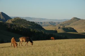 After our ride several of us climbed up to the ridge behind our camp for fabulous views of the surrounding valleys and toward the plains in the distance. The next morning, I again climbed the ridge as the sun rose. I was fortunate to find a herd of horses grazing next to a single ger in front of the dramatic views of the rolling hills.