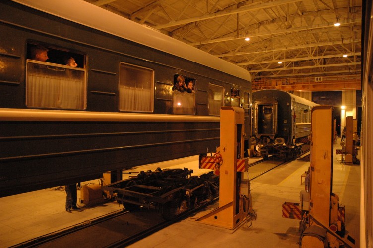 The border crossing between Mongolia and China took several hours but was broken up by the changing of the wheels. Russia and Mongolia use 5ft broad gauge track, while China uses 4’8.5″ standard gauge. Rather than moving passengers between carriages, the Chinese lift the carriages (and passengers) in the air and replace the wheels.